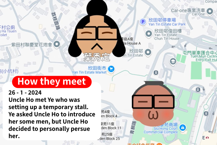On January 26, 2024, Uncle Ho met a mainland Chinese woman named Ye Xiuding who was setting up a stall in a market in Tuen Mun. At that time, Ye Xiuding said that she hoped Uncle Ho could introduce some men to her.